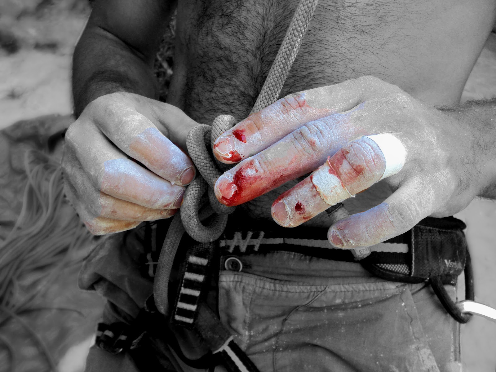 ahí está la pared solitaria, tranquila, bella, sencilla, paciente, apacible. esa pared esconde aquello que no te ha dejado tranquilo en las últimas semanas. cómo algo tan terreno como escalar una pared lo podemos elevar a un punto tan profundo. ahí radica la pasión. tu pasíón. tu forma de entender la escalada. para tí es algo más. es una forma de demostrarte que eres poderoso. poder que quieres compartir con la montaña. el encadene de esa vía. es una parte de tí que aún no te pertenece a tí. esa vía que te atrae y es tu gran batalla. es la primera vez que afrontas una vía con tanto espíritu. tu pasión se muestra en cada detalle. es tu primera lucha seria, al límite. arnés, cuerda, magnesio y pies de gato están impacientes por entrar en acción. te los pones sin darte cuenta, casi como si ellos se hubieran lanzado a tí. aunque cuidas cada detalle. nudo bien hecho y peinado, como si fuera a pasar un examen. arnés bien ajustado a tu cintura. magnesio cubriendo completamente tus manos, para evitar cualquier fallo que se pueda derivar de cualquier pizca de sudor. pies de gato pretos y ajustados. todo en su punto. perfección de libro. tu corazón late deprisa, silencioso, pero percute con fuerza. tus manos, casi temblorosas, tocan la roca. sienten el frío que la habita. también sienten el calor de estar de nuevo con un amigo. con un viejo conocido. ese viejo conocido que respeta tus callos, cortes y heridas, muestra de tu entrega. ese viejo conocido que aprecia tu piel ruda, curtida, basta y endurecida por acariciarle constantemente. es como un animal, que acaricias pero que a veces te muerde, haciendote caer. en el próximo pegue a lo mejor tienes más suerte. la roca, el animal, decidirá.